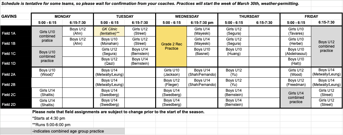 Spring season runs from late March to early June. In the spring, there are 1-2 practices per week, with day(s) of the week typically determined by the coach's availability. In the spring, there is the option for 2 practices due to more daylight and we offer two time slots 5-6:15 and 6:15-7:30 pm. Also, SSA tries to offer combined age group practices in the spring where space is possible and coaches are available to run them.
